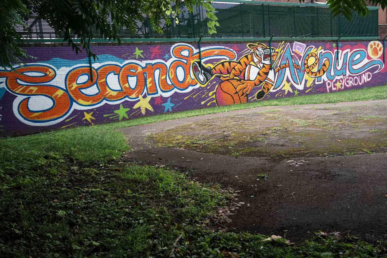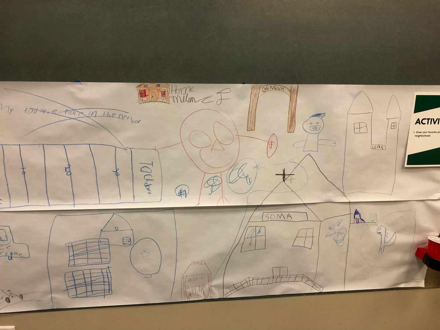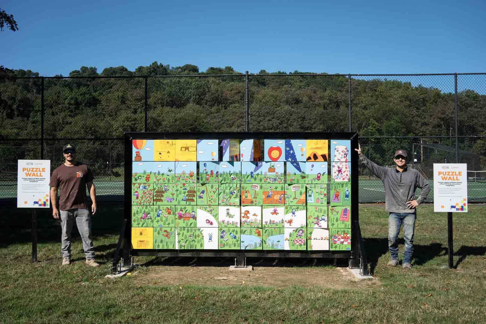 During that time, NN held 2 community listening sessions to learn about what folks valued. Along with the artists, 90 participants of all ages attended these sessions and shared their thoughts through art, written and spoken word, and games. It was during these sessions that the locations for the installations were identified as the practice field at the high school, Second Ave Playground, and Neighborhood North. Additionally, 60 5th grade art students contributed drawings and text that share what they love most about Beaver Falls. These drawings were integrated into the design of one of the installations, creating one side of the Puzzle Wall at the high school.